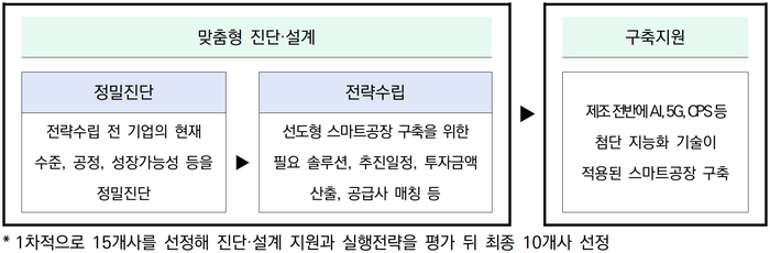 선정된 기업은 전문기관 등을 통해 기업별 상황에 맞는 맞춤형 정밀진단과 연차별 전략수립을 먼저 지원받는다. 그리고 그 결과에 따라 인공지능·5세대(5G) 등 첨단 솔루션을 지원함으로써 체계적인 구축이 추진되도록 기획됐다.