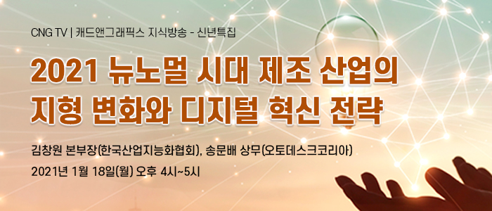 | 주제 | [신년특집]2021 뉴노멀 시대 제조 산업의 지형 변화와 디지털 비즈니스 트렌드 | 발표자 | 김창원 본부장(한국산업지능화협회), 송문배 상무(오토데스크코리아) | ||