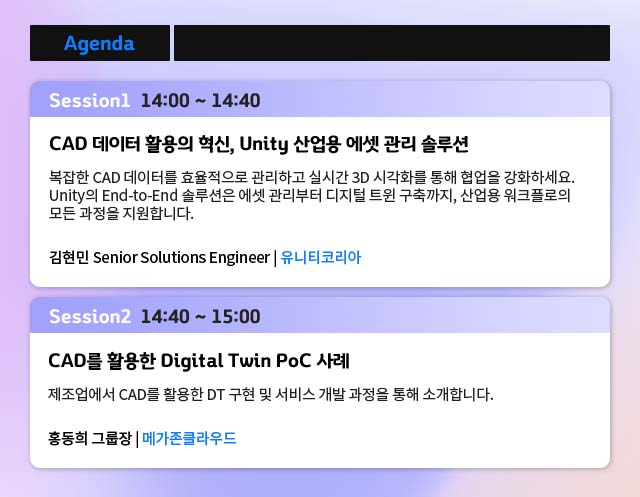 | 발표자 | 김현민 Senior Solutions Engineer(유니티코리아), 홍동희 그룹장(메가존클라우드) | 주최 | 캐드앤그래픽스 |