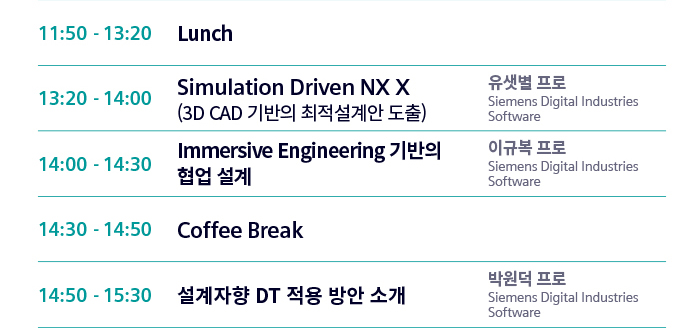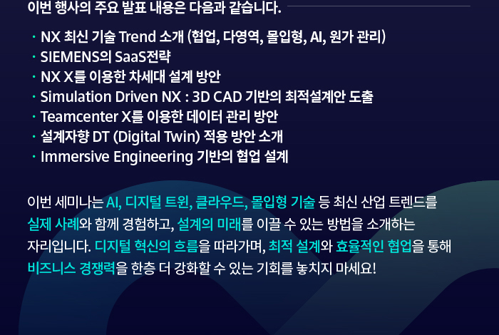 이번 행사에서는 협업, 다영역 설계, 몰입형 기술, AI, 원가 관리 등 다양한 분야에서 NX가 제공하는 최신 트렌드를 소개하며, 이를 통해 어떻게 비즈니스 가치를 극대화할 수 있는지 알아봅니다.